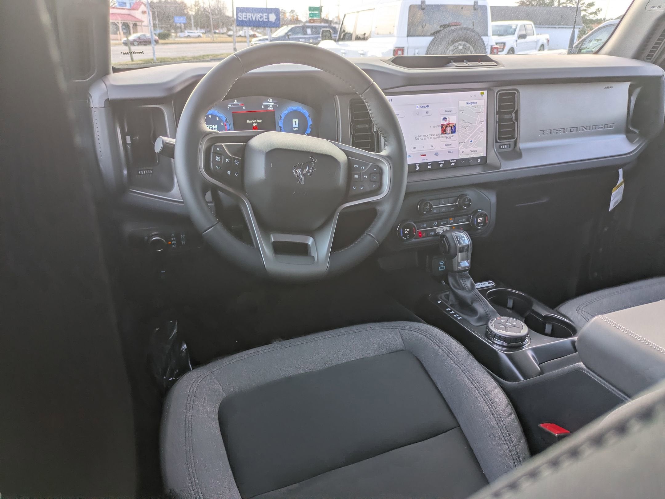 2025 Ford Big Bend Bronco 2-Door Intelligent Access w/Lock/Unlock, 4-Wheel Disc Brakes, 4.46 Axle Ratio, 7 Speakers, ABS brakes, Air Conditioning, Alloy wheels, AM/FM radio: SiriusXM with 360L, AM/FM Stereo, Ambient Footwell Lighting, Auto High-Beam Headlamps, Auto High-beam Headlights, BLIS Blind Spot Information System, Brake assist, Carbonized Gray Molded-In-Color Hard Top, Cloth Bucket Seats, Compass, Connected Navigation, Delay-off headlights, Dr & Pass Illuminated Sliding Visor Vanity Mirrors, Driver door bin, Driver vanity mirror, Dual front impact airbags, Dual front side impact airbags, Dual Smart Charging USB Ports, Dual-Zone Electronic Automatic Temperature Control, Electronic Stability Control, Emergency communication system: 911 Assist, Equipment Group 222A Mid Package, Exterior Parking Camera Rear, Front anti-roll bar, Front Bucket Seats, Front Center Armrest, Front License Plate Bracket, Front reading lights, Front Row Heated Seats, Front wheel independent suspension, Fully automatic headlights, Hard Top Sound Deadening Headliner, Heated door mirrors, Illuminated entry, Integrated roll-over protection, Internet access capable: FordPass Connect, Lane-Keeping System, Leather Shift Knob, Low tire pressure warning, Occupant sensing airbag, Outside temperature display, Overhead airbag, Overhead console, Panic alarm, Passenger door bin, Passenger vanity mirror, Power door mirrors, Power Outlet - Back Side of Center Floor Console, Power steering, Power windows, Pre-Collision Assist w/Automatic Emergency Braking, Radio data system, Rear Parking Sensors, Rear-View Camera, Rear-Window Defroster & Washer, Remote keyless entry, Security system, SiriusXM w/360L, Speed control, Split folding rear seat, Steering wheel mounted audio controls, SYNC 4, Tachometer, Telescoping steering wheel, Tilt steering wheel, Traction control, Trip computer, Variably intermittent wipers, Wheels: 17" Carbonized Gray-Painted Aluminum.